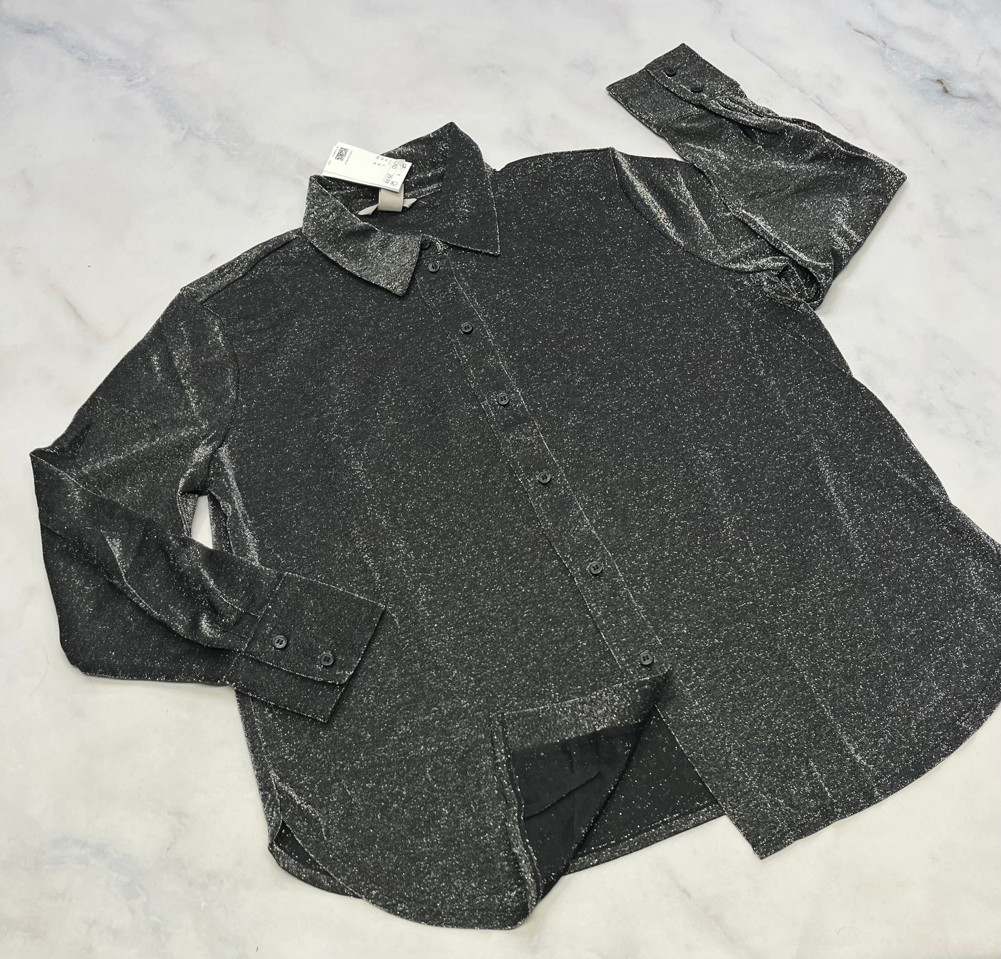 Chemisier argenté : M/ femme L/ femme coupe confo : pique pas stretch de partout . Molle et neuve !